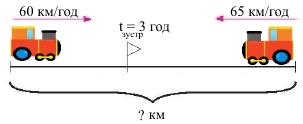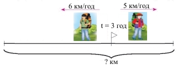 Дві туристичні групи одночасно вийшли з турбази в протилежних напрямках. Швидкість однієї групи становила 6 км/год, а швидкість іншої — 5 км/год. Яка відстань буде між групами через 3 год?