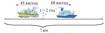 З однієї пристані одночасно в протилежних напрямках вийшли два теплоходи. Один із них рухався зі швидкістю 45 км/год, а інший — зі швидкістю 60 км/год. Яка відстань буде між ними через 2 год?