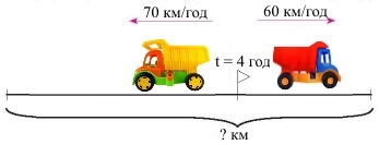 Два вантажні автомобілі одночасно виїхали з автопарку в протилежних напрямках. Швидкість одного з них становила 70 км/год, а швидкість іншого — 60 км/год. Якою буде відстань між ними через 4 год?