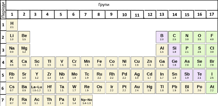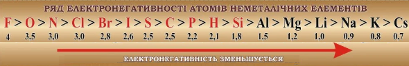З урахуванням електронегативності укладено ряд електронегативності хімічних елементів, в якому кожний наступний хімічний елемент характеризується меншою електронегативністю за попередній: