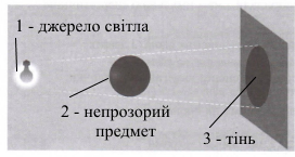 Якщо на шляху поширення світла стане прозора перешкода, утвориться тінь (проміння пройде через перешкоду).