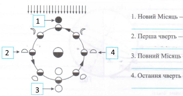 Завдання 3 На схемі пронумеруй фази Місяця та опиши вигляд у фазах.