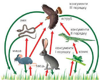 Трава — коник — ящірка — яструб — жук-гнойовик.