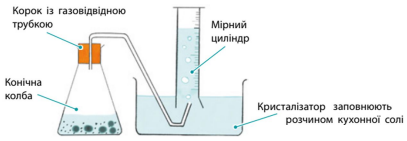 Учні й учениці досліджували способи виявлення вуглекислого газу та зібрали прилад, зображений на малюнку.