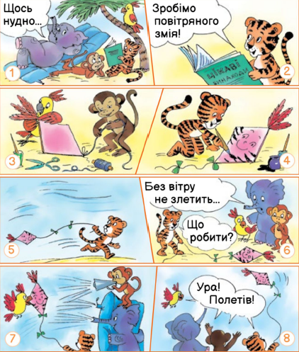 Тигреня читало книжку «Цікаві винаходи», а слоненя нудьгувало. Тоді тигреня запропонувало зробити повітряного змія. Друзі взялися до роботи. Мавпеня з папугою роздобуло картон і нитки. Потім до аркуша прив’язали нитку. Тигреня гарно розмалював паперового змія. Можна запускати іграшку. На жаль змій не злітав. Слоненя зрозуміло, що без вітру не злетить. Тигреня хвилювалося. Воно не знало що робити.